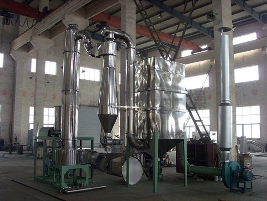 熱空氣切線進入干燥器底部,在攪拌器帶動下形成強有力的旋轉風場。膏狀物料由螺旋加料器進入干燥器內,在高速旋轉攪拌槳的強烈作用下,物料受撞擊、磨擦及剪切力的作用下得到分散,塊狀物料迅速粉碎,與熱空氣充分接觸、受熱、干燥。脫水后的干物料隨熱氣流上升,分級環(huán)將大顆粒截留,小顆粒從環(huán)中心排出干燥器外,由旋風分離器和除塵器回收,未干透或大塊物料受離心力作用甩向器壁,重新落到底部被粉碎干燥。