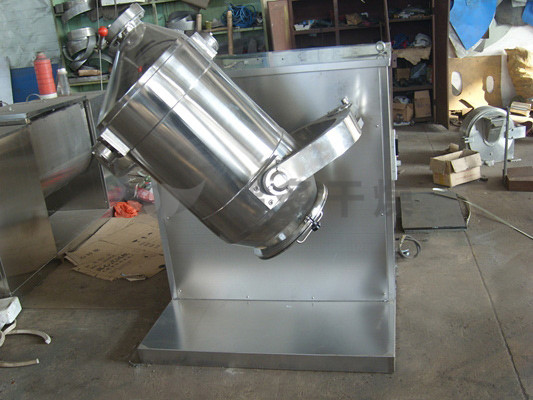 裝料的筒體在主動軸的帶動下,作周而復(fù)始的平移、轉(zhuǎn)動和翻滾等復(fù)合運(yùn)動,促使物料沿著筒體作三向復(fù)臺運(yùn)動,從而實(shí)現(xiàn)多種物料的互相流動、擴(kuò)散、積聚、摻雜,以達(dá)到均勻混合的目的。