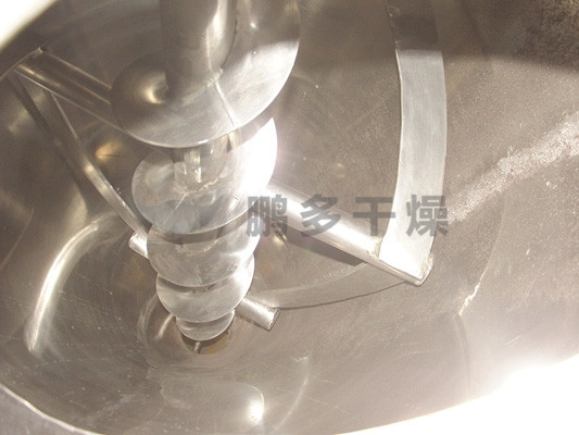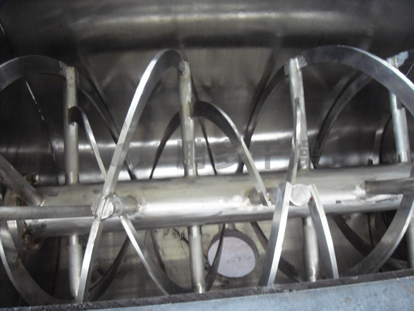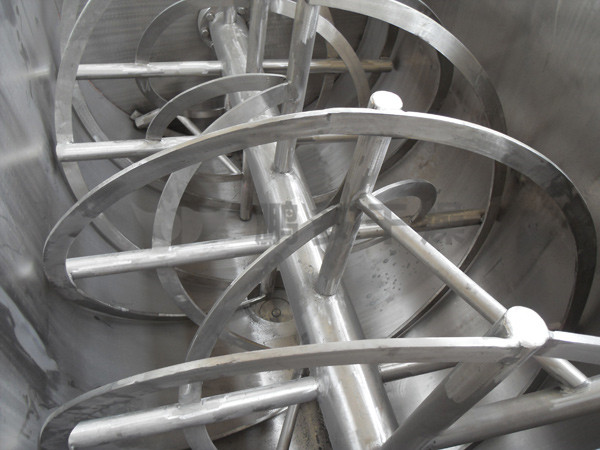 該機(jī)型由容器、螺旋攪拌葉片和傳動(dòng)部件組成:螺旋葉片一般做成雙層或三層,外層螺旋將物料從兩側(cè)向中央?yún)R集,內(nèi)層螺旋將物料從中央兩側(cè)輸送,形成對(duì)流混合。