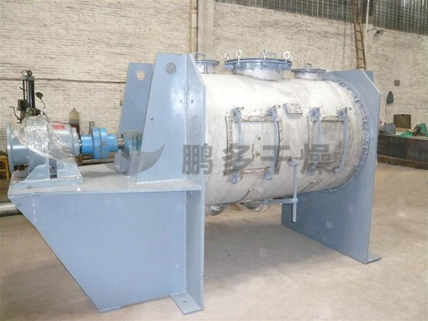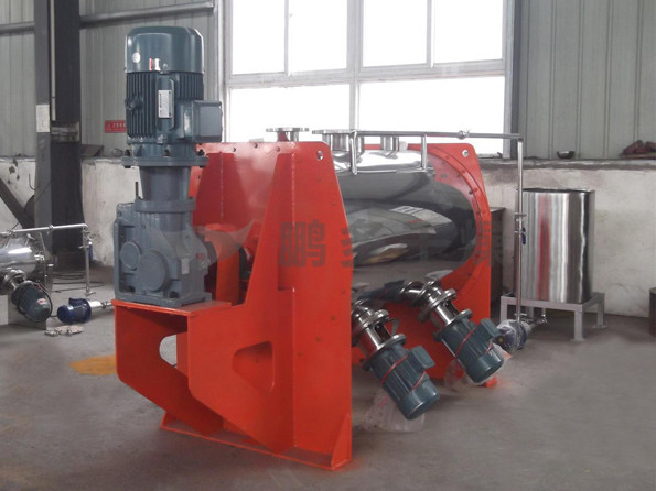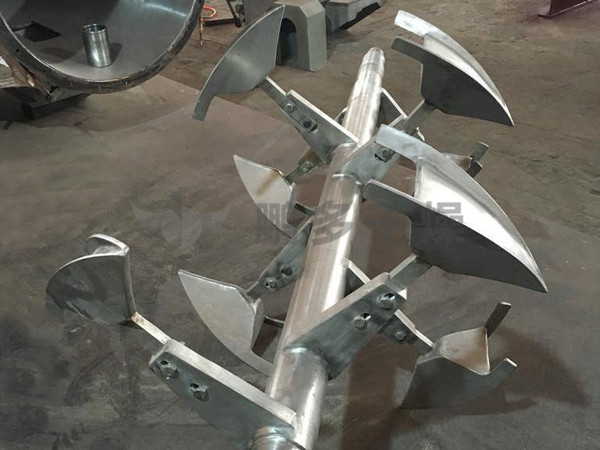 該機(jī)型由傳動(dòng)機(jī)構(gòu)、臥式筒體、犁刀、飛刀四部分組成,物料在犁刀作用下沿筒壁作軸向流支,當(dāng)物料流經(jīng)飛刀時(shí)被高速度旋轉(zhuǎn)的飛刀拋灑,從而在較短時(shí)間內(nèi)達(dá)到均勻混合。