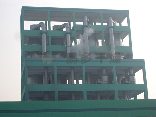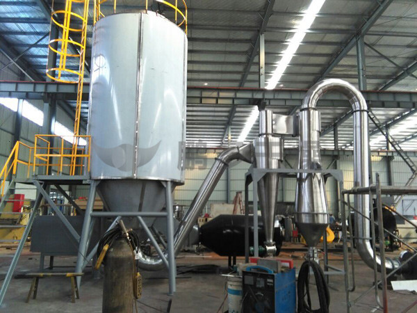 本機(jī)組工作過程為料液通過隔膜泵高壓輸入,噴出霧狀液滴,然后同熱空氣并流下降,大部分粉粒由塔底排料口收集,廢氣及其微小粉末經(jīng)旋風(fēng)分離器分離,廢氣由抽風(fēng)機(jī)排出,粉末由設(shè)在旋風(fēng)分離器下端的授粉筒收集,風(fēng)機(jī)出口還可裝備二級除塵裝置,回收率在96-98%以上。