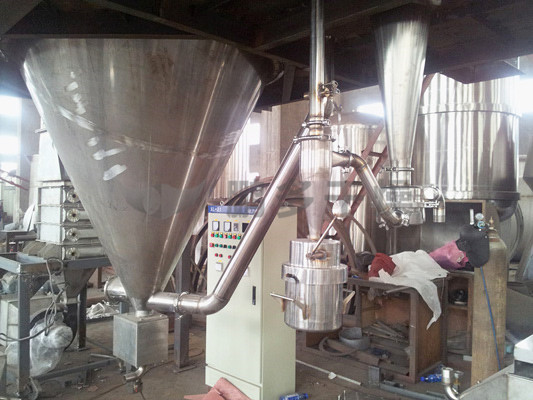 該機(jī)采用全封閉形式,所有部件均采用不銹鋼制造,配有三級(jí)凈化裝置,過(guò)濾后的空氣達(dá)十萬(wàn)級(jí)要求。筒體與頂部裝有冷壁裝置,使壁溫<80℃,干燥塔內(nèi)裝有氣刷掃塔裝置。經(jīng)該機(jī)干燥后的中藥浸膏粉,不會(huì)出現(xiàn)焦化變質(zhì)現(xiàn)象,大大增加了收粉率(95%以上),而且不會(huì)產(chǎn)生混藥現(xiàn)象和粘壁現(xiàn)象。